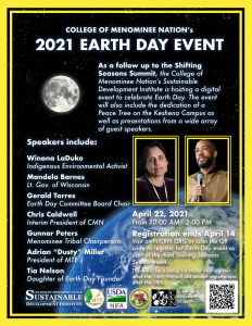 SDI is excited to announce that the College of Menominee Nation’s Earth Day event is going to be a digital event this year. This event will directly follow the third Shifting Seasons Summit on April 22nd, 2021 from 10:00AM-2:00PM. We will have a lot of amazing speakers at the event, including Indigenous Environmental Activist Winona LaDuke and the Lieutenant Governor of Wisconsin Mandela Barnes to name a few. Also as part of the event, there will be a dedication of a Peace Tree on the Keshena Campus. A more detailed agenda for the event will follow.