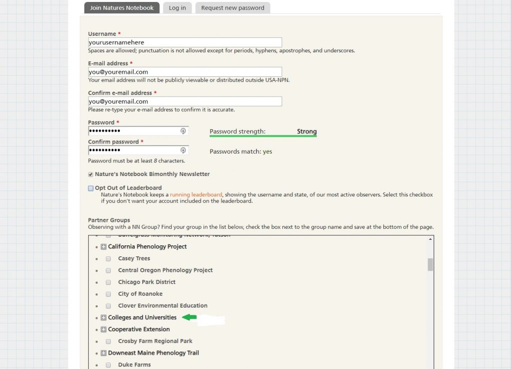 Community members and students wishing to act as citizen scientists along the trail are welcome to get an account on Nature’s Notebook. Nature’s Notebook is a site hosted by the USA National Phenology network which allows anyone to record data on the phenophases of a particular plant. While setting up your account, find the Partners box, expand “Colleges and Universities” and find College of Menominee Nation Phenology Walk to be taken to our page. Users can also download an app to record their data on the go.