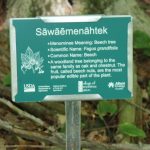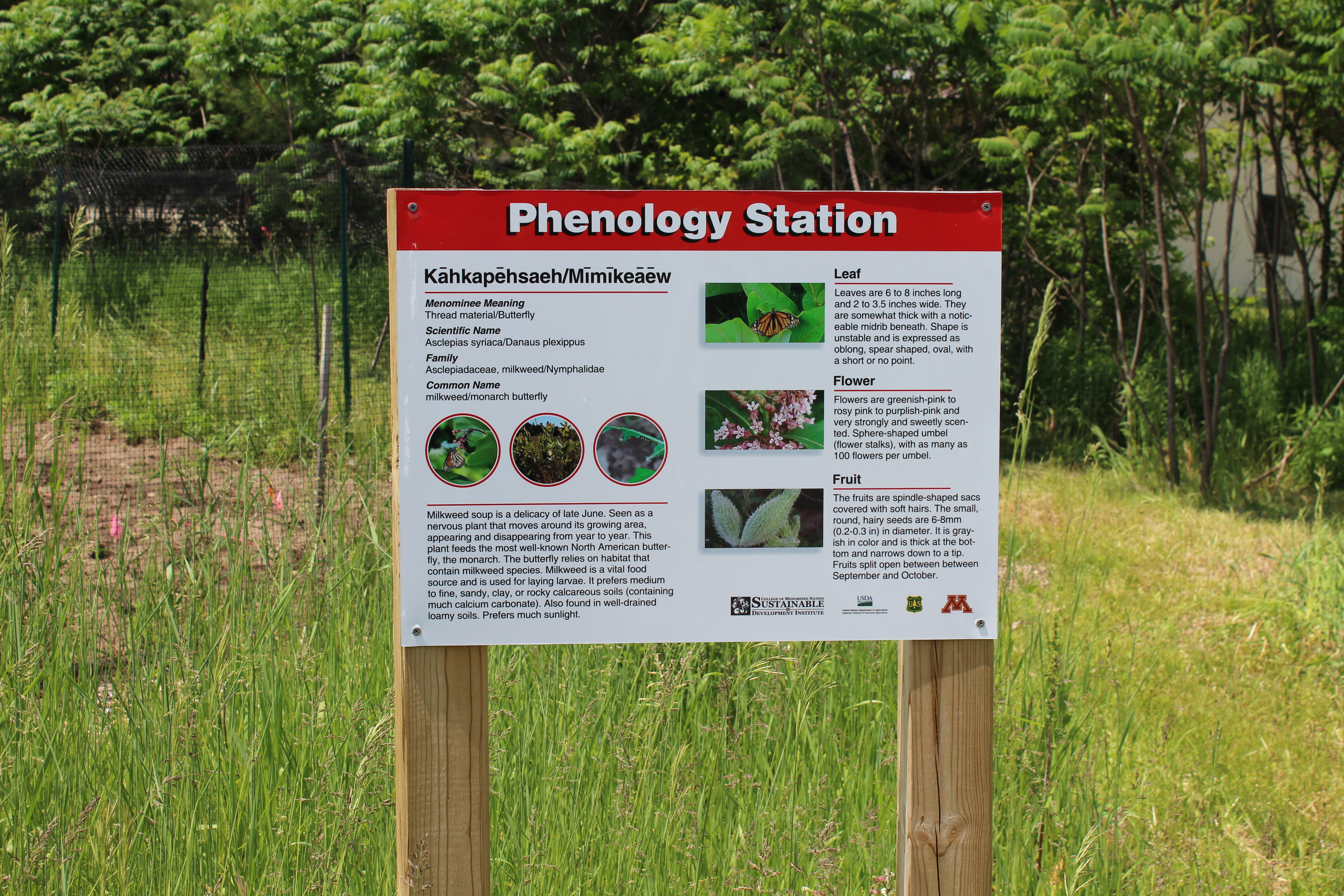 Plants along the trail are marked with both red and green signs. Learning Path signs, which are small and green, are marked with the Menominee name first, followed by the scientific name, common name, and a brief description. The Phenology Stations, marked by larger red and white signs, include more detailed information such as the leaf, flower, and fruit phenophases with a description and accompanying photograph.