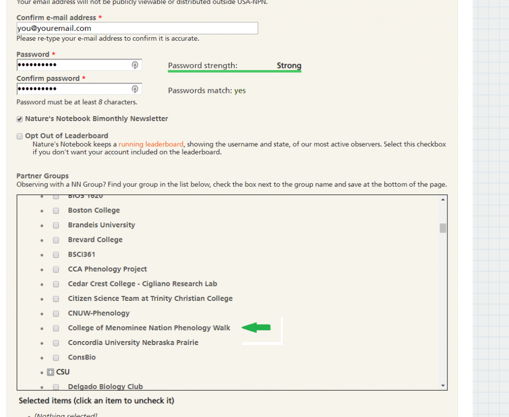 Community members and students wishing to act as citizen scientists along the trail are welcome to get an account on Nature’s Notebook. Nature’s Notebook is a site hosted by the USA National Phenology network which allows anyone to record data on the phenophases of a particular plant. While setting up your account, find the Partners box, expand “Colleges and Universities” and find College of Menominee Nation Phenology Walk to be taken to our page. Users can also download an app to record their data on the go.