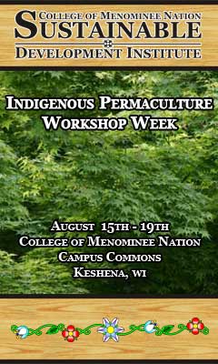 The College of Menominee Nation Sustainable Development Institute will be hosting a series of workshops that will focus on the practices associated with indigenous permaculture. Participants will learn about the practices and methods of Indigenous Permaculture through hands-on experience. Each course has a fee of $50.00 Registration Forms can be downloaded at the following link.